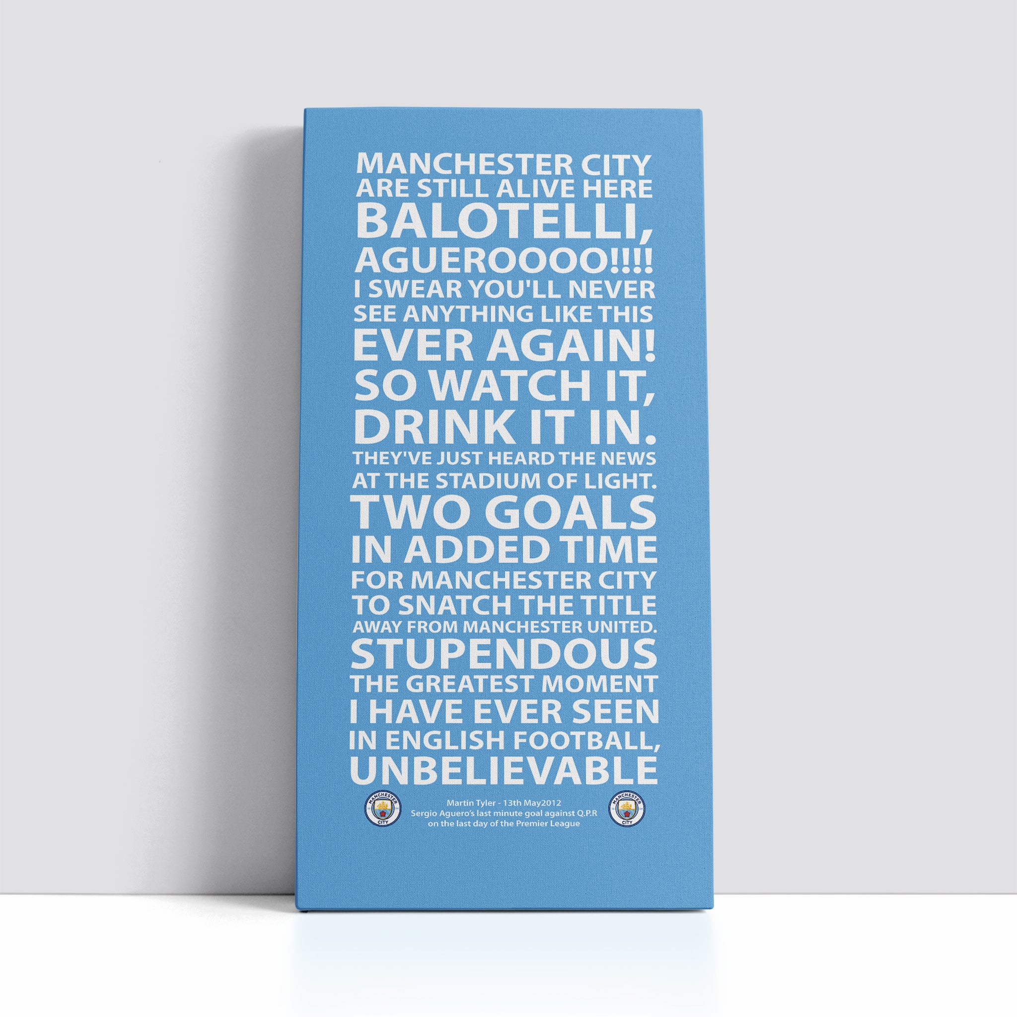 This is our Aguero Canvas, taken from the words of Martin Tyler, before and after Sergio Aguero scored the dramatic last minute goal against Queens Park Rangers on 13th May 2012 to WIN the Premier League for Manchester City on the final day of the Premier League.
