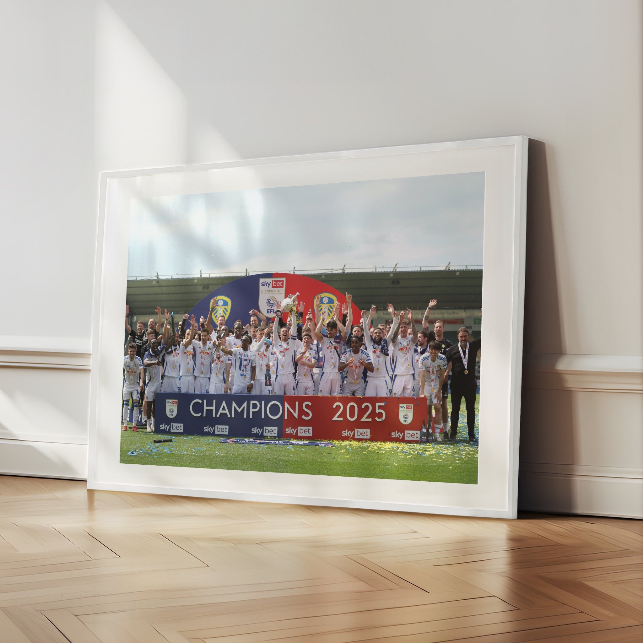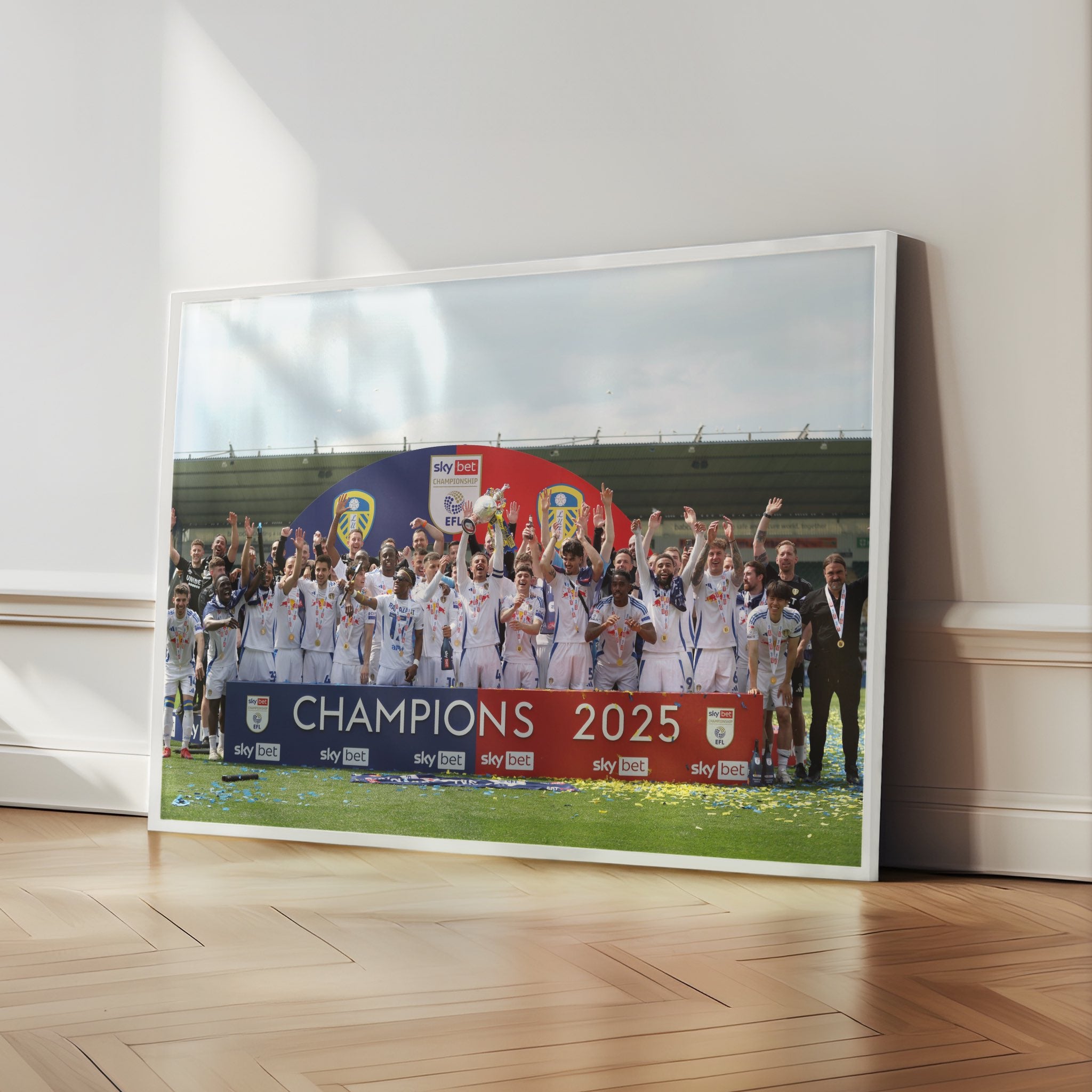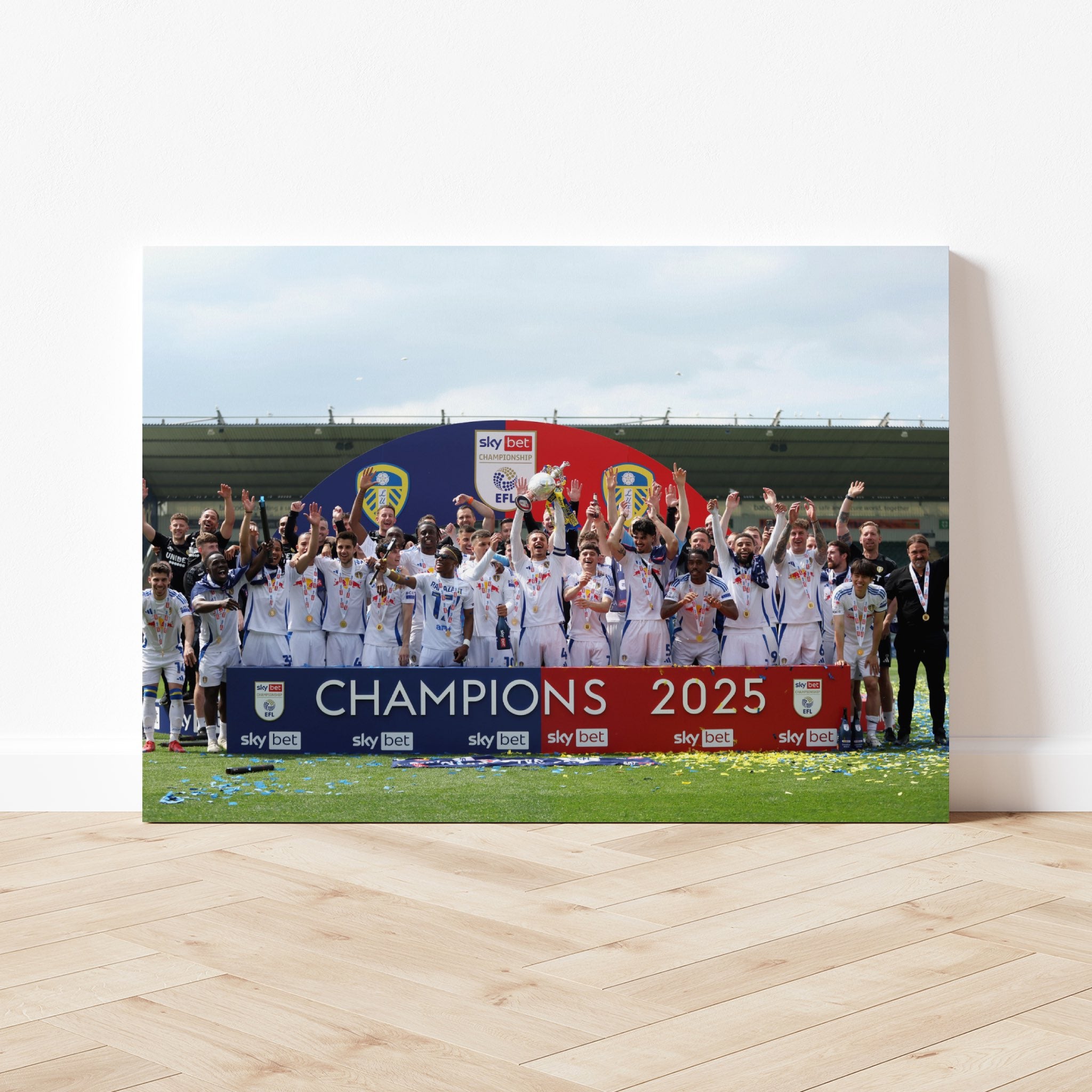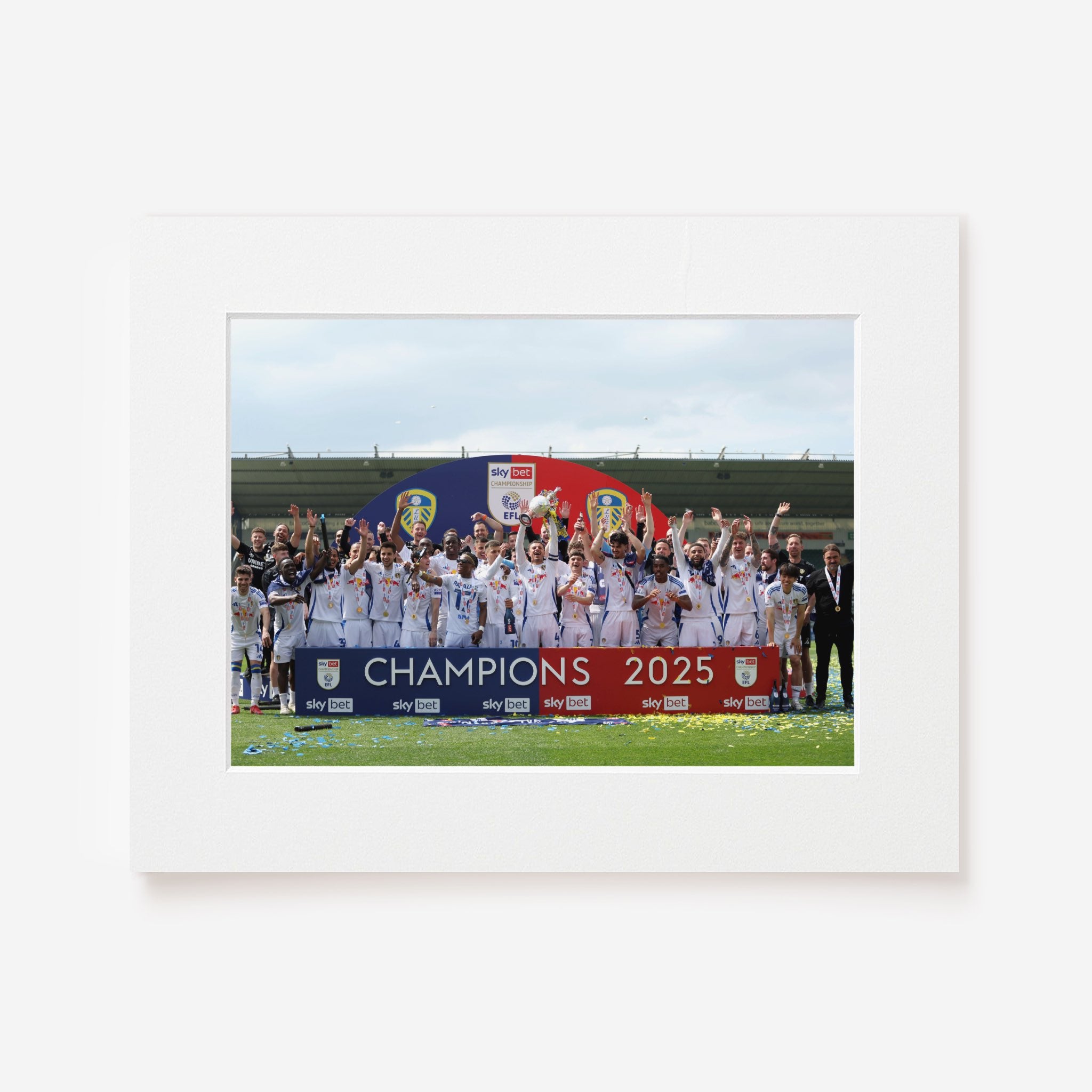 This is our Leeds United Championship Winners 24/25 items, which is apart of our Sports Collection. This taken from Trophy Lift on Saturday 3rd May 2025 where they awarded the Championship Trophy after winning Championship for the season of 2024/2025!