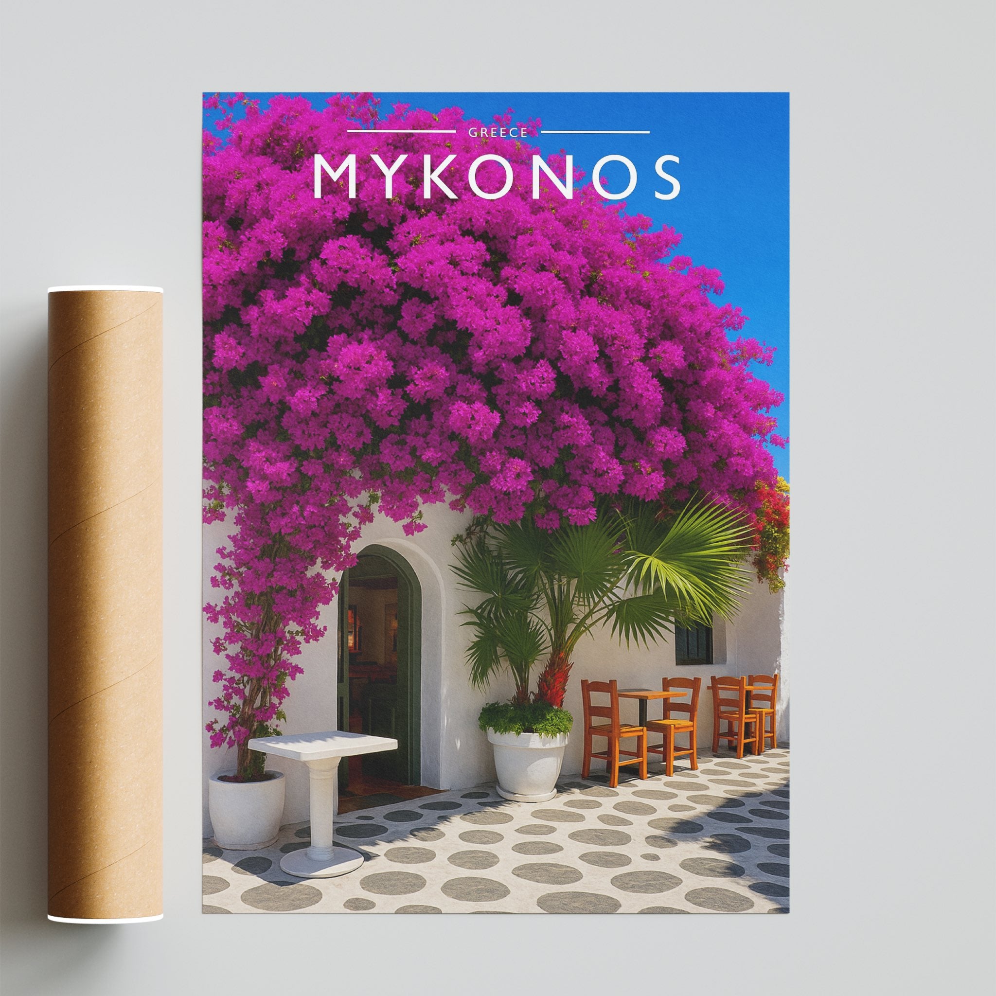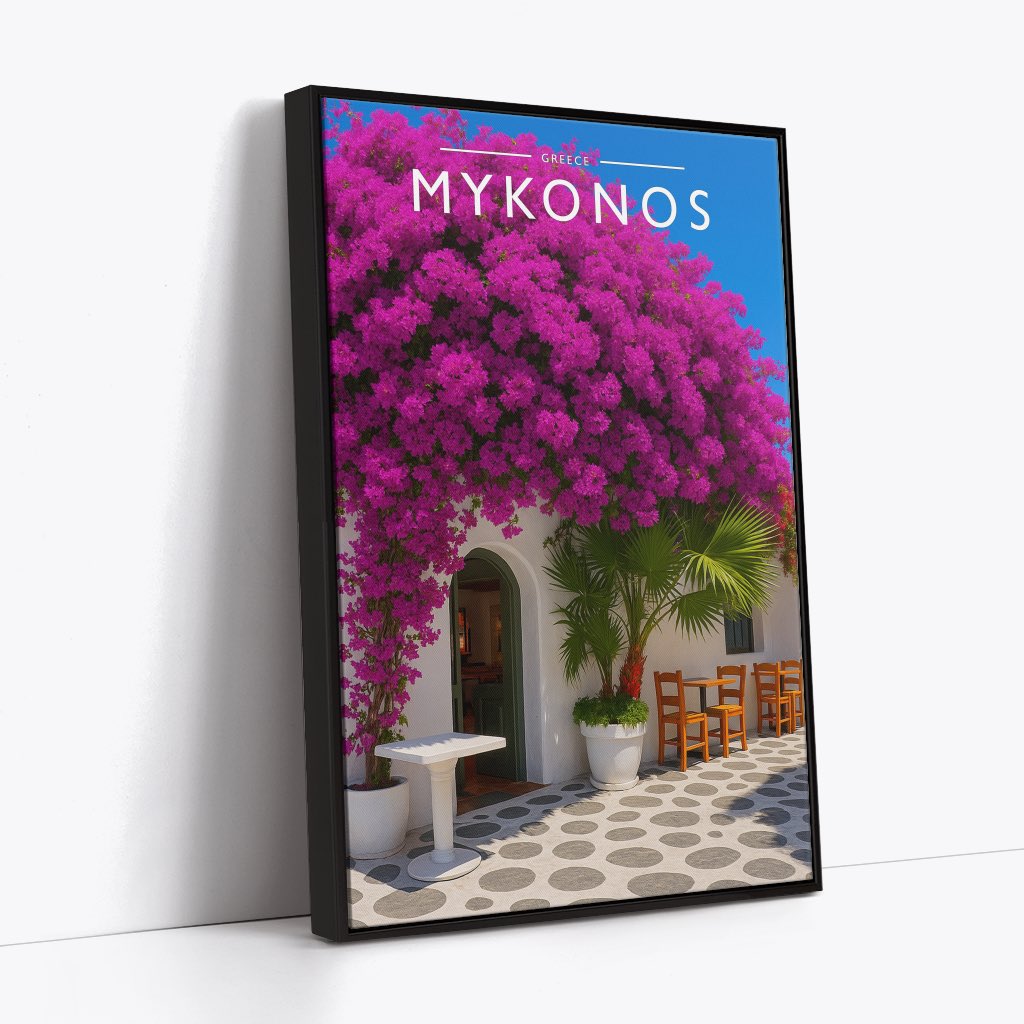 Celebrate the enchanting charm place of Mykonos this striking travel poster, showcasing this Geece destination in vivid colour and detail.