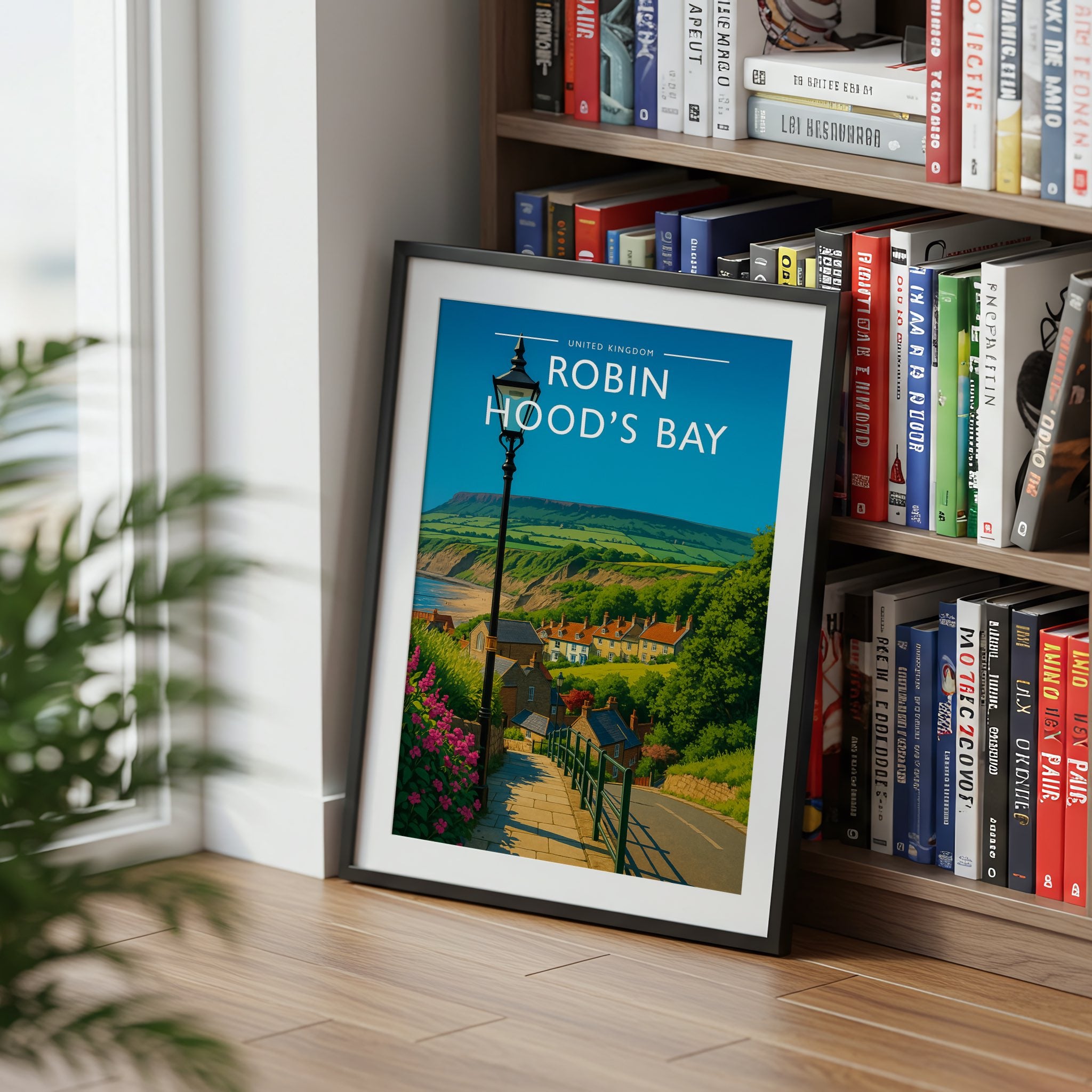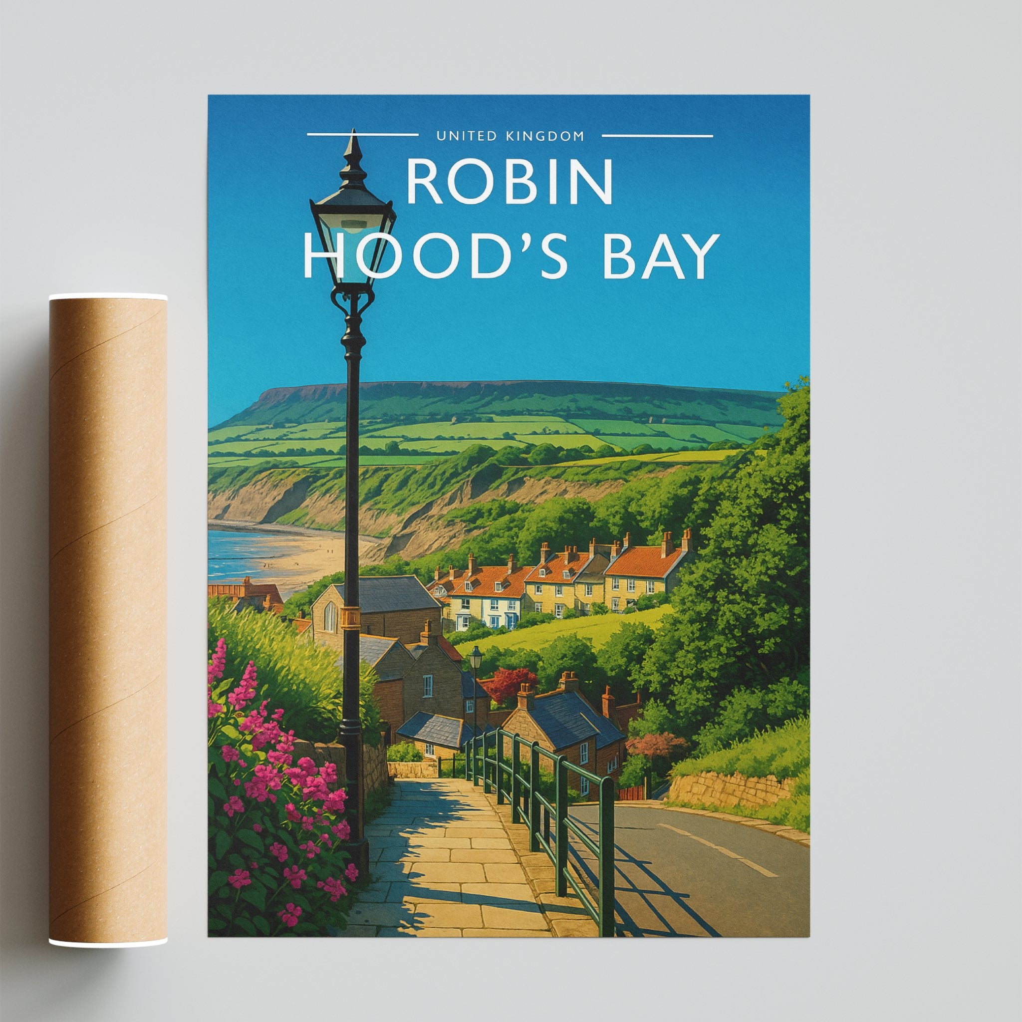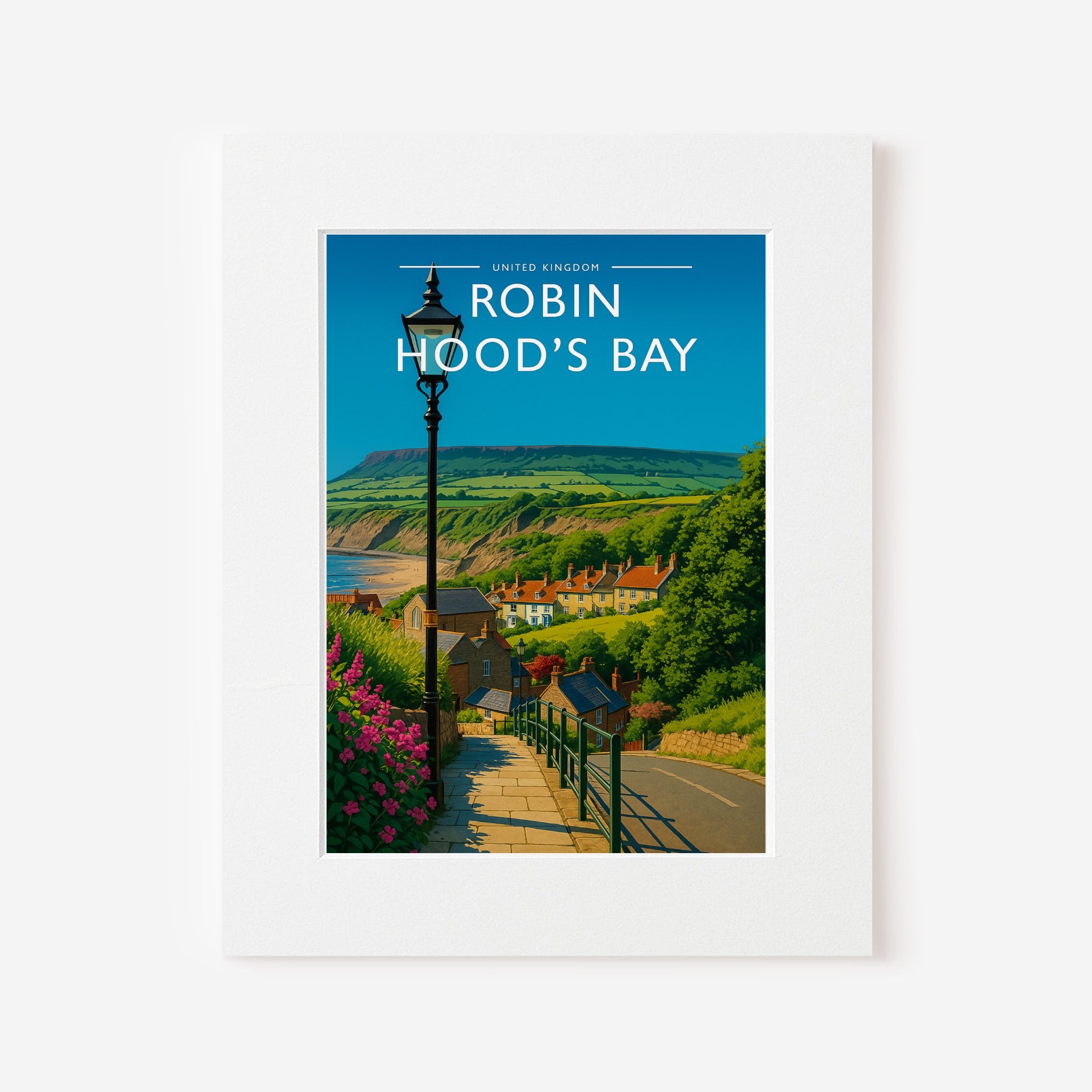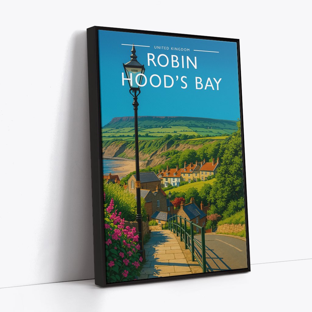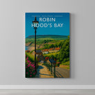 Celebrate the enchanting charm place of Robin Hood's Bay this striking travel poster, showcasing this UK destination in vivid colour and detail.