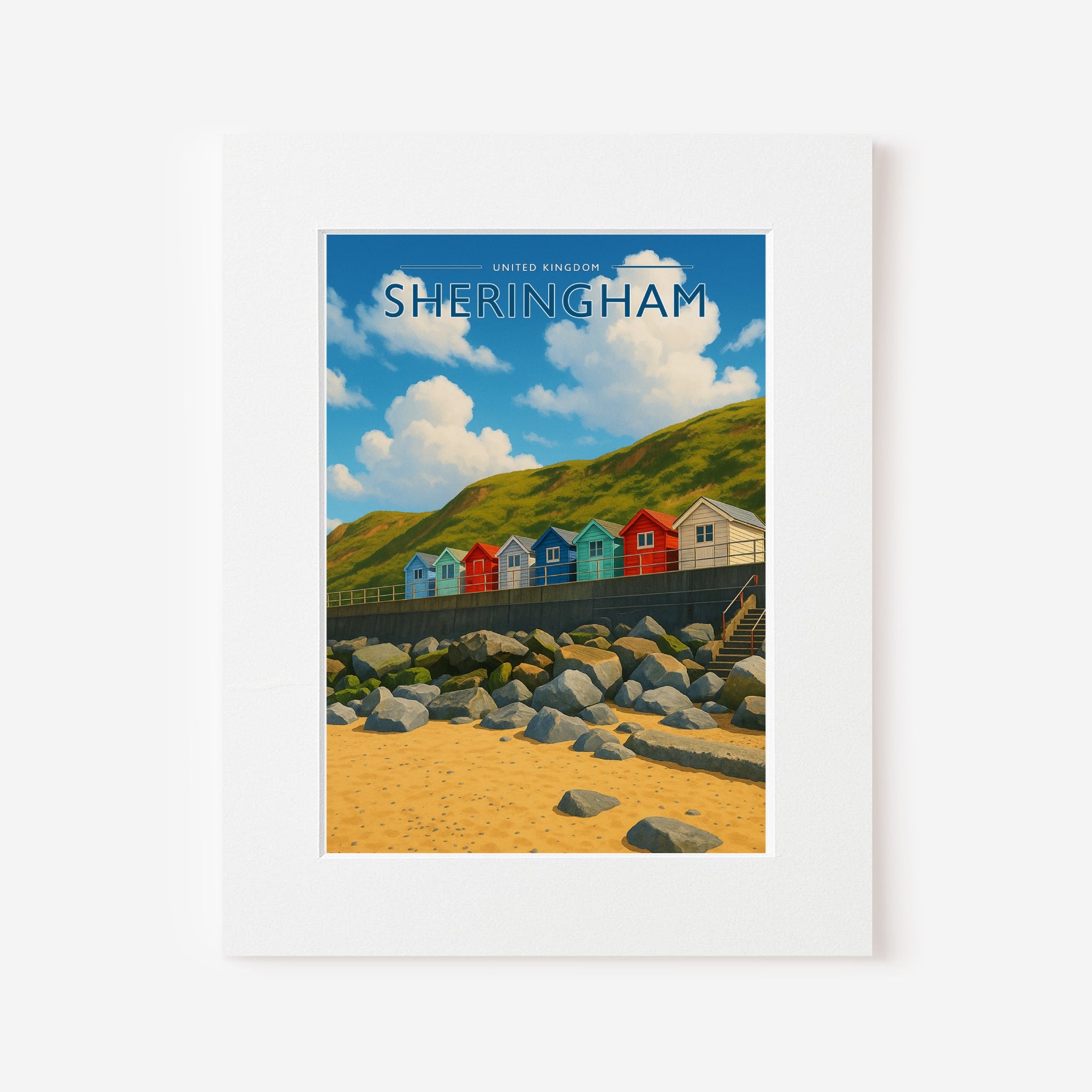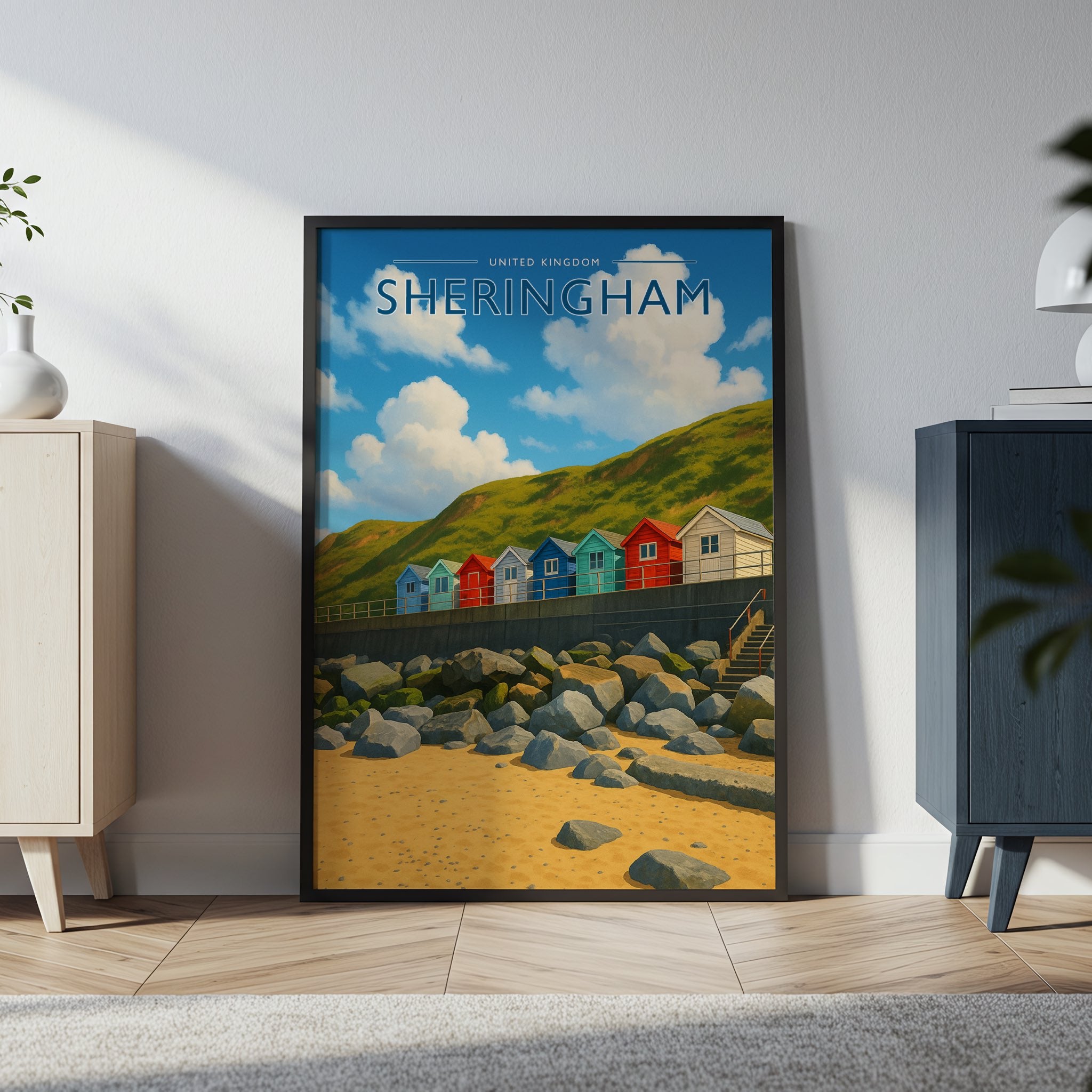 Celebrate the enchanting charm place of Sherringham this striking travel poster, showcasing this UK destination in vivid colour and detail.