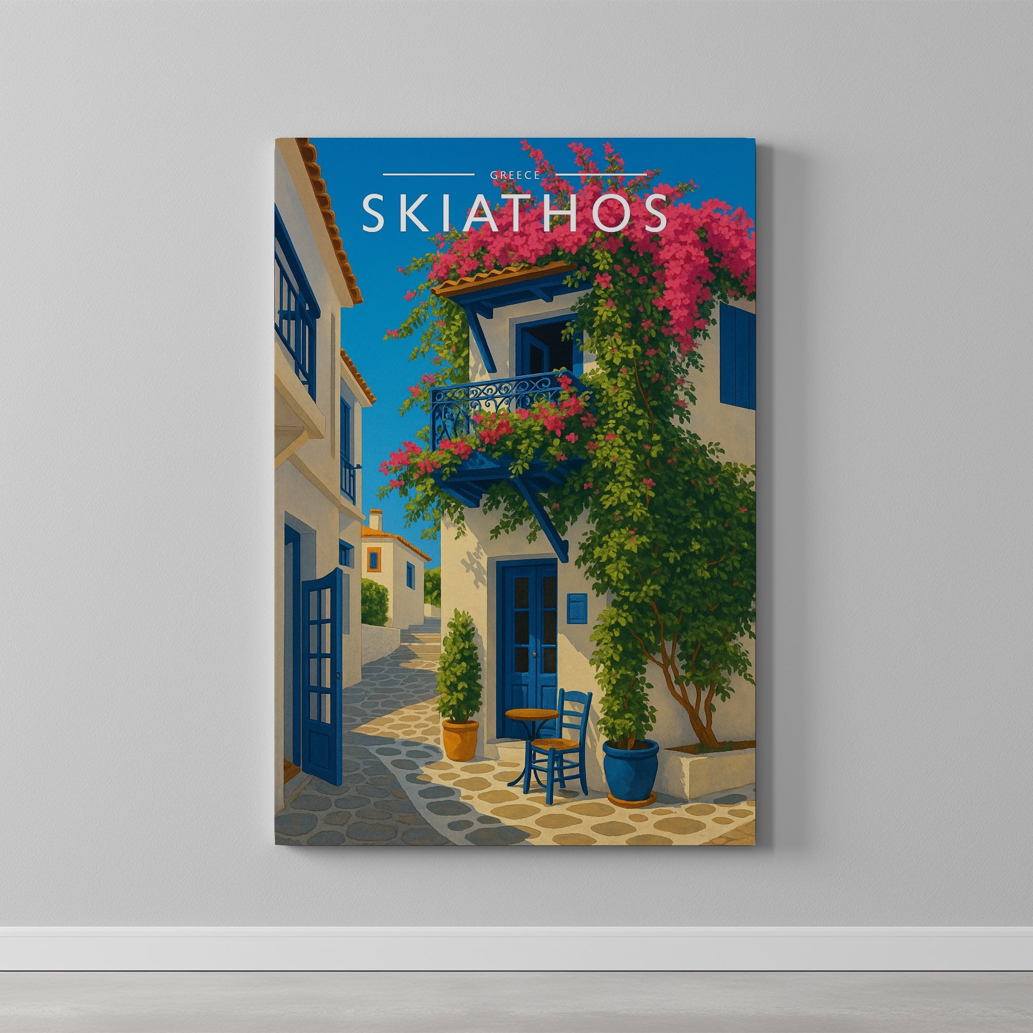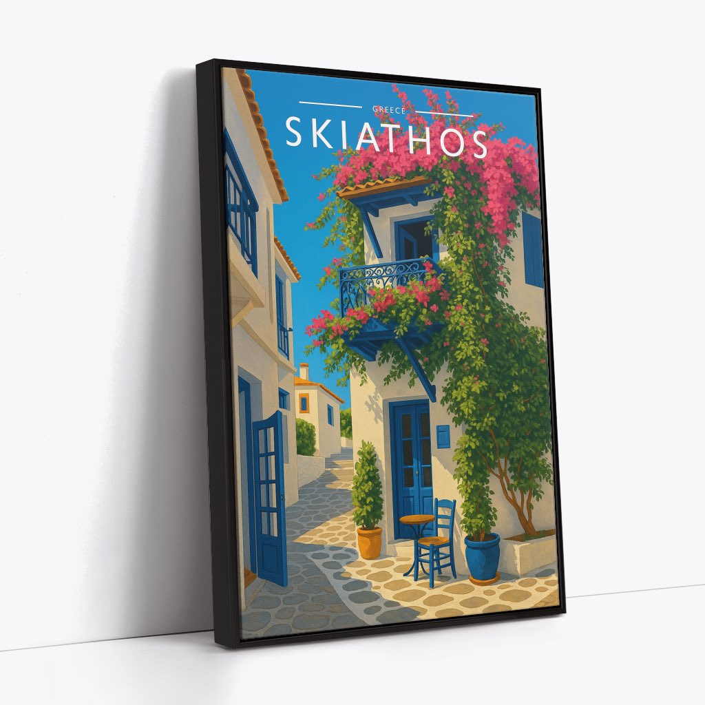 Celebrate the enchanting charm place of Skiathos this striking travel poster, showcasing this Greek destination in vivid colour and detail.